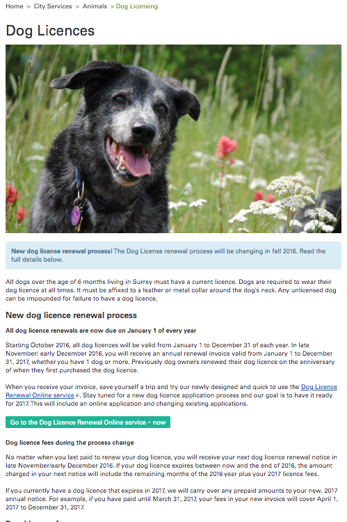 In 2016 the City of Surrey changed the renewal process for dog licenses, and this needed to be communicated. After reviewing multiple emails, charts and reports I cut down content to feature key takeaways for residents. As a result the Surrey Now pulled chunks of text from the website almost word for word
