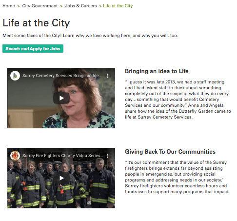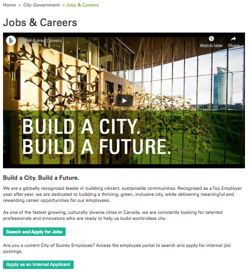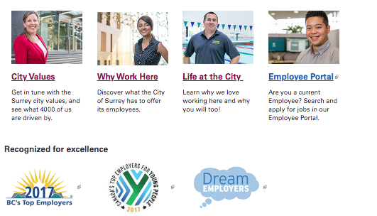 In 2017 I worked with the Human Resources team and User Experience team to audit the Careers section of Surrey.ca. The Human Resources Team had just updated their print material to be more aligned with the corporate City brand and were looking to help tell their story through their digital assets. This includes the relationship between surrey.ca and the intranet, PeopleSoft, and on-boarding content.