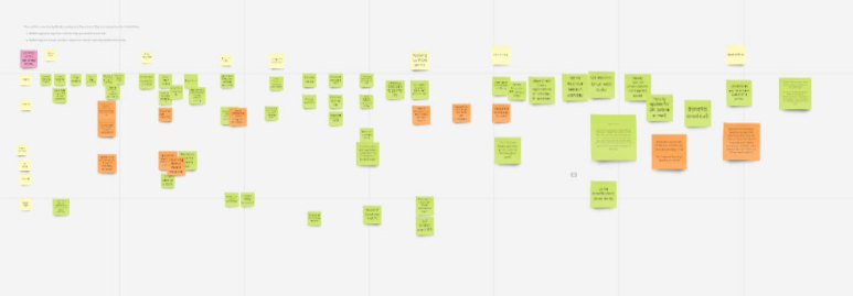 After the interviews, I ran three virtual user journey workshops using Miro to better understand the user journeys of our users. The topics for the workshops were based off the top topics that came up during user interviews. They were also tailored based on the attendees who were participating in the workshop.